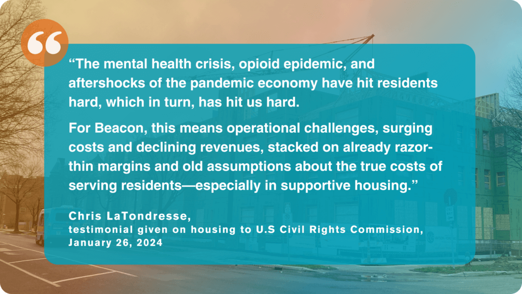 At Beacon, we’ve always understood the gap between what the public sector funds and what it truly takes to sustain the deeply affordable and supportive homes we know are essential to disrupt homelessness.