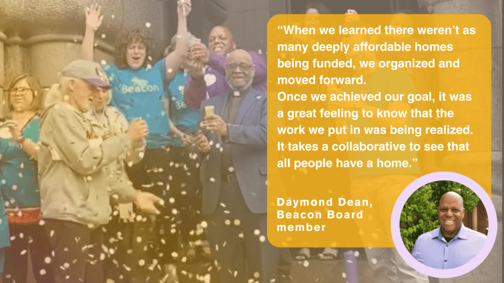 While reflecting on his advocacy, Daymond described experiencing “a great feeling to know that the work we put in was being realized. It takes a collaborative to see that all people have a home.” Daymond represents one of many Beacon board members, advocates, and leaders striving toward that mission.