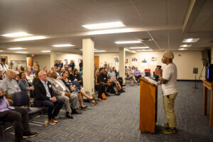 Marcy Frost, member of Temple Israel and of both the 2010 and 2020 Emerson Village teams, spoke at the celebration, sharing the history of this development and reminding all gathered that our work is not complete.
