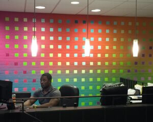 (Pictured, front desk at Nicollet Square with mural.)