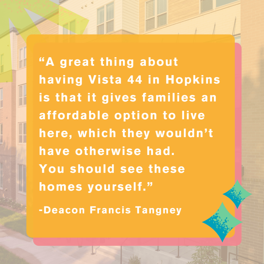 As a neighbor of Vista 44 in Hopkins, Deacon Francis Tangney from St. Gabriel the Archangel Catholic Church watched Beacon’s family-supportive housing get built from the ground up.