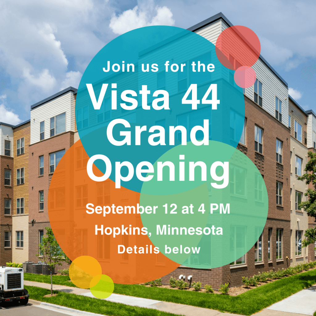 Let’s celebrate that we have reached the point where families are moving into affordable, supportive homes at Vista 44! Join us on Thursday, September 12, from 4:00 to 5:30 p.m. in Hopkins as we celebrate the efforts of the Beacon community in making the Vista 44 dream a reality.