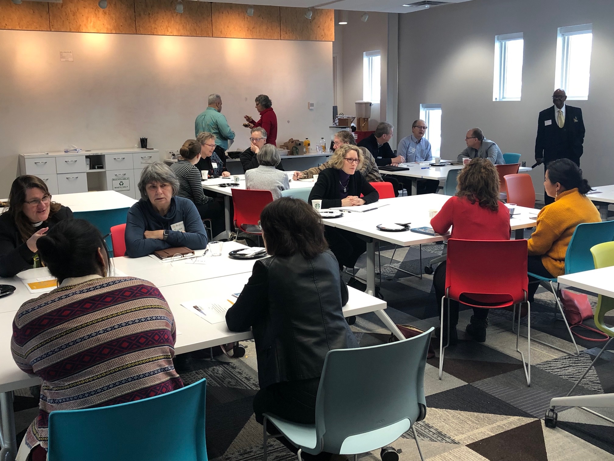 Valentines Day, February 14th at 7:30 a.m. it was still dark out and 0 degrees, and I thought, “What a perfect day for a Faith Leader Breakfast.” As I parked my car along Prior Avenue next to a snow bank, I could see the Habitat for Humanity Building at the corner and the lights were on. I was greeted by a Habitat for Humanity team member, Bryanna, who quickly welcomed me and gave a quick tour of the building. All the tables were set up, the sound system worked, Reverend Gonzales of “Mother” St. James A.M.E. Church in Minneapolis arrived, ready to emcee the event. The quiche, hot coffee, fruit, and orange juice were on hand to welcome our guests who began to arrive at 7:50 a.m.