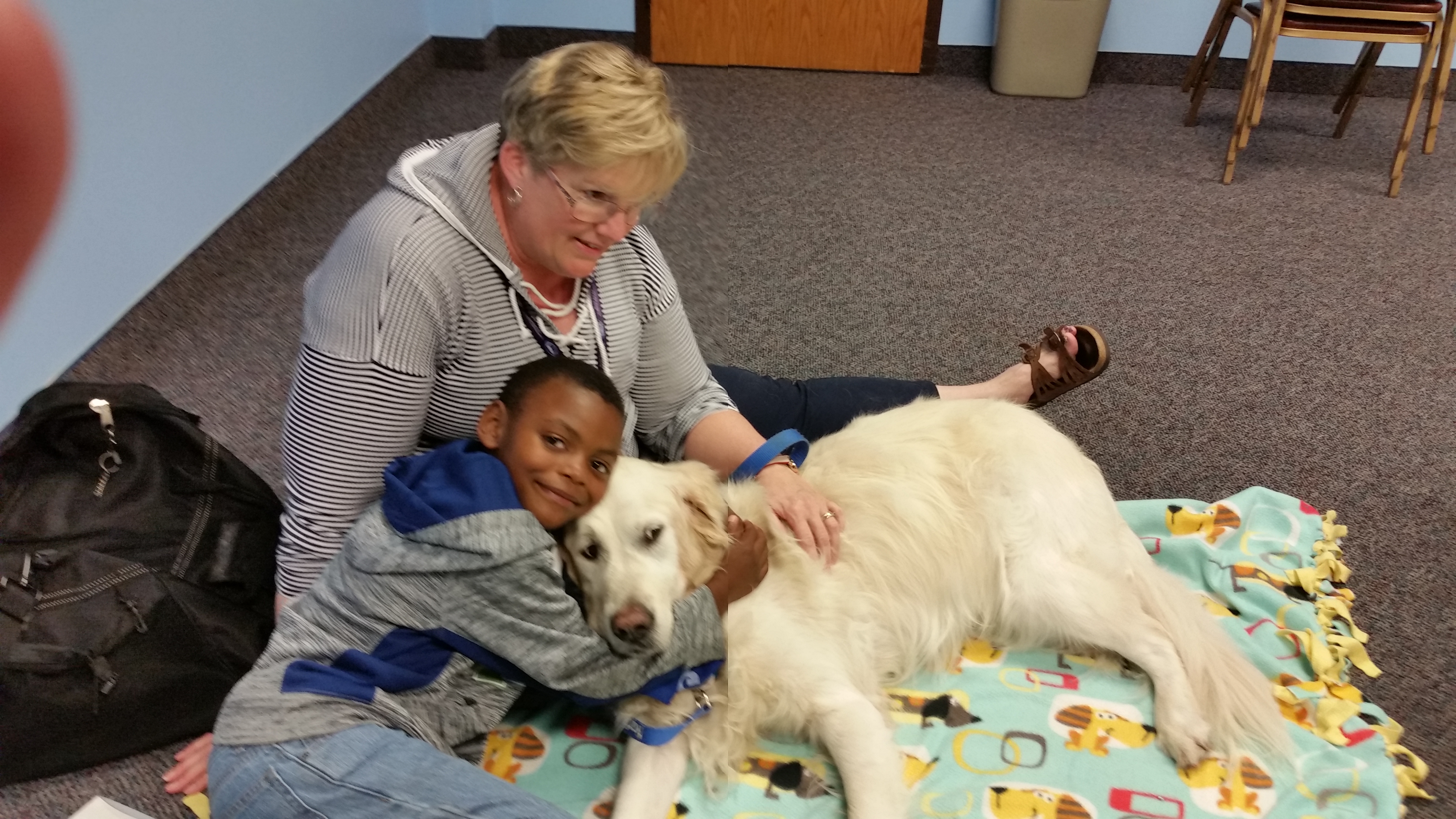 The children last week were excited to see the therapy animals, but before we started we did an active game to get them focused a little bit and then they took turns petting the animals and learning about them. For about 20-25 minutes they visited with the animals and were much more relaxed than when we arrived, enjoying connecting with them. They especially liked feeding the guinea pigs, which made them laugh, and snuggling up to Cooper the golden retriever. One of the little girls asked to hold “Toto” the pretty brown guinea pig, and under supervision she was very quiet and still, whispering “I love you” to the guinea pig. That same guinea pig was held by an at-risk teen in another program and she said that it was the calmest she had felt in months. Sometimes it is moments not minutes that mean the most.