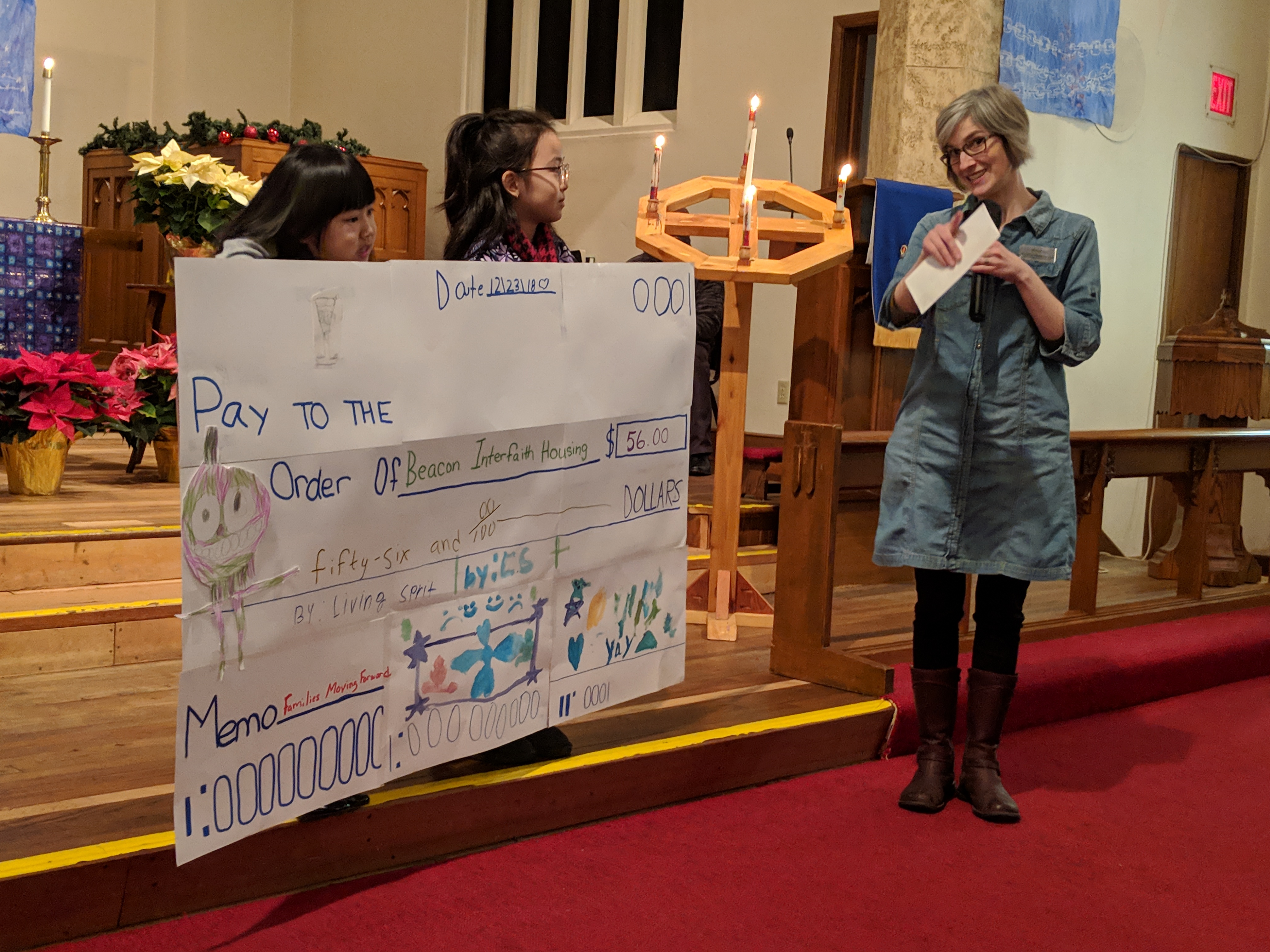 On the fourth Sunday of Advent, I visited Living Spirit to receive a big gift on behalf of our Families Moving Forward shelter program – a check for fifty-six dollars raised by the Children’s Church class this fall. That’s a lot of quarters and nickels! During the worship service, the children presented me with a giant handmade “check” to Beacon with Families Moving Forward carefully printed on the memo line.