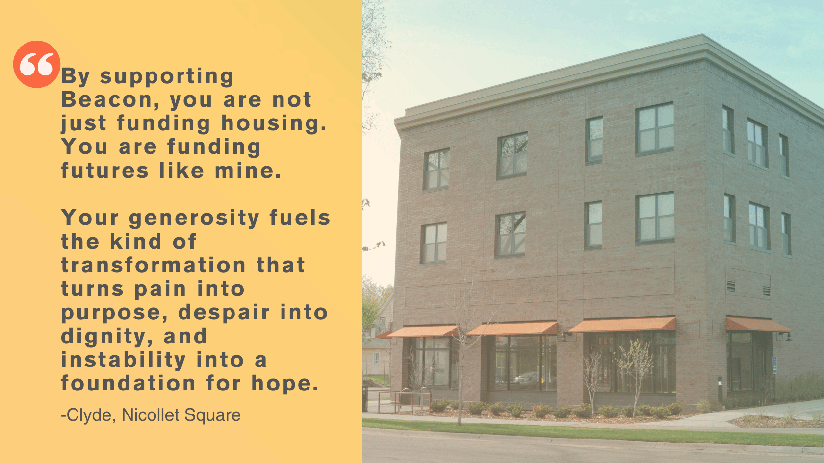 In closing, I want to thank you for your generosity. It fuels the kind of transformation that turns pain into purpose, despair into dignity, and instability into a foundation for hope. Supporting Beacon’s work means supporting lives like mine and many others yet to come.