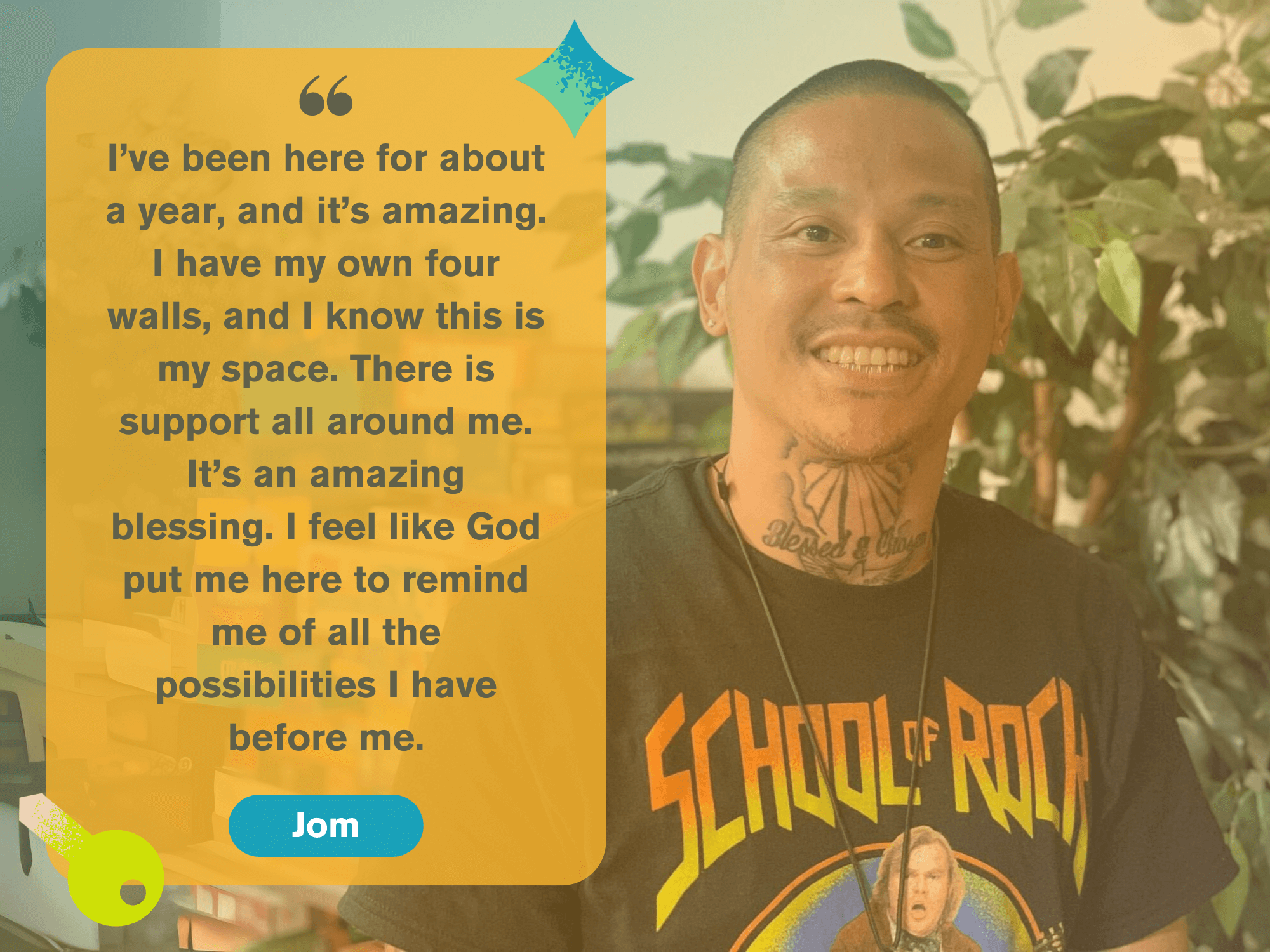 Jom describes his time without a home as a series of loops and cycles. Often, he felt caught up in a repetitive pattern of incarceration, short-term shelter, and being back on the streets. This is a cycle that’s felt by too many individuals experiencing chronic homelessness, especially by those who are Black, Indigenous, and people of color.