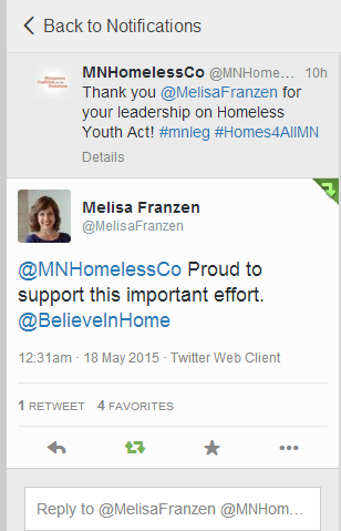 Our advocacy coordinator, Michael Dahl, reports that Sen. Melisa Franzen, who represents Edina, the future home of our 66 West housing for youth who have experienced homelessness, gave kudos from the Senate floor to the grassroots supporters of the measures. (She even tagged us in her Tweet.) We – you — lobbied hard for a $2 million increase in funding for the Homeless Youth Act, and an increase in the age of eligibility for certain programs to 24 from the current 21. Both provisions have been approved and now it’s up to Governor Dayton.